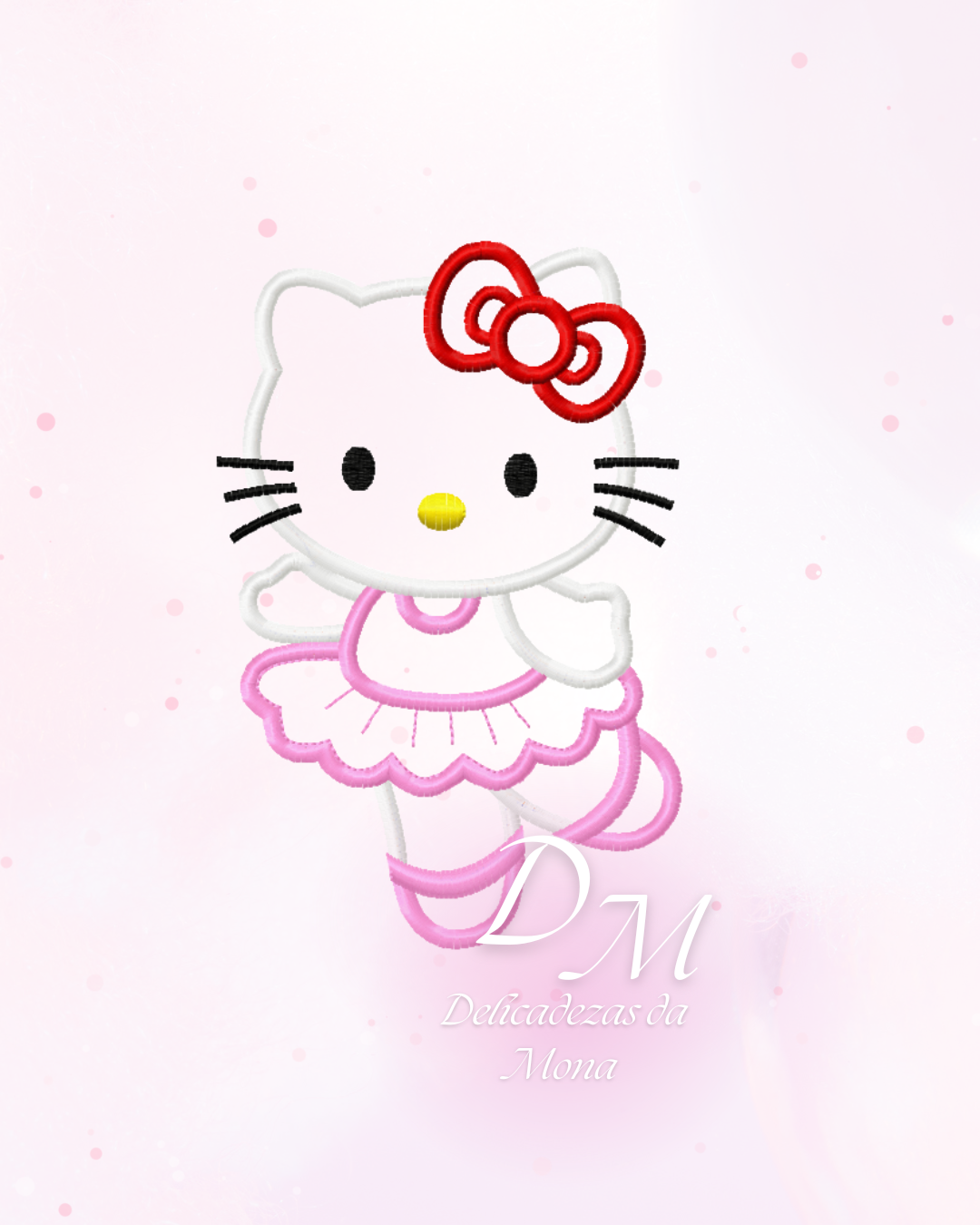 Matriz de bordado delicada inspirada em uma gatinha estilo kawaii, com traços suaves e acabamento elegante. O design apresenta a personagem com laço vermelho, vestido de bailarina em tons de rosa e detalhes bem definidos no rosto, como olhos, nariz e bigodes. Ideal para aplicação em peças infantis, enxovais, roupas personalizadas e itens decorativos.